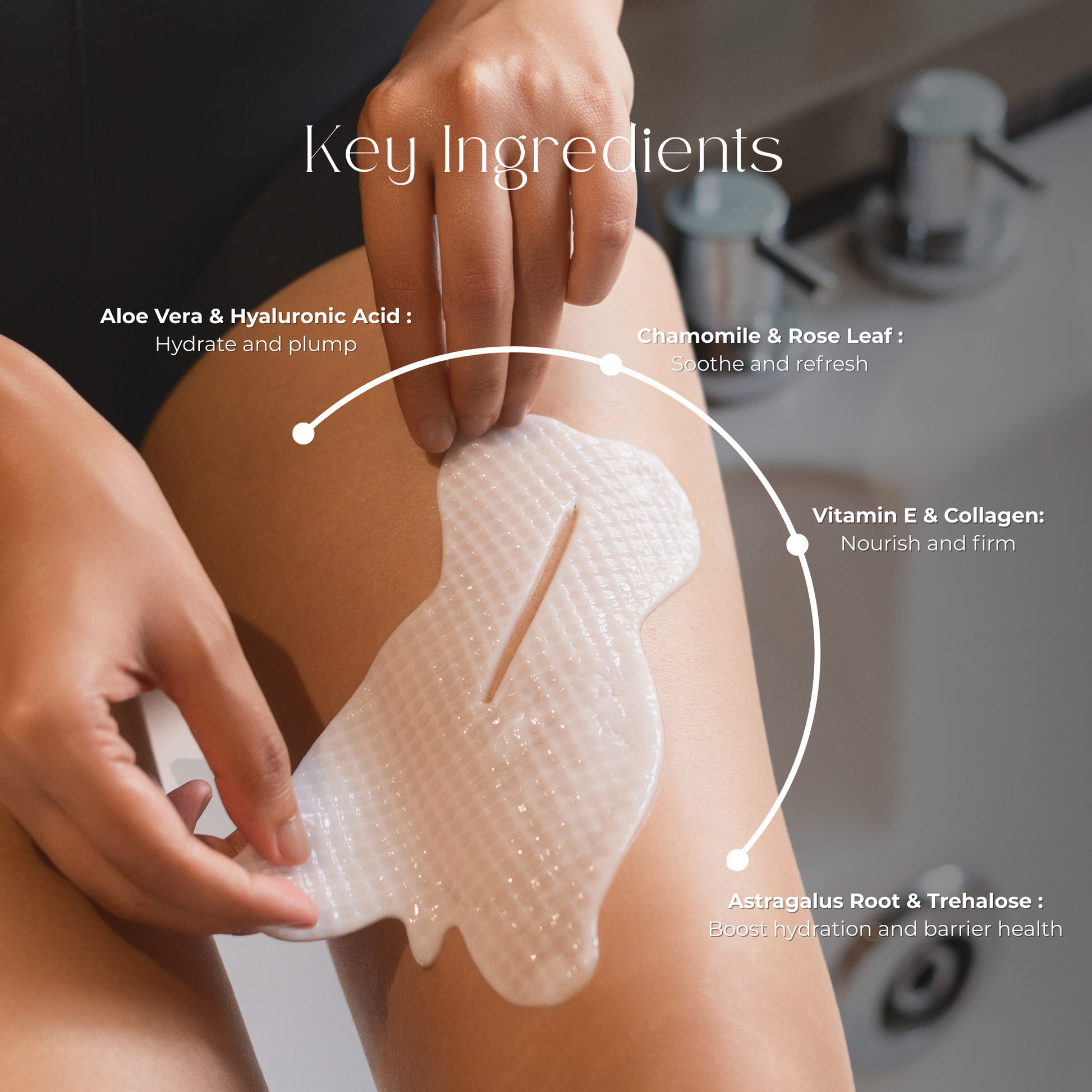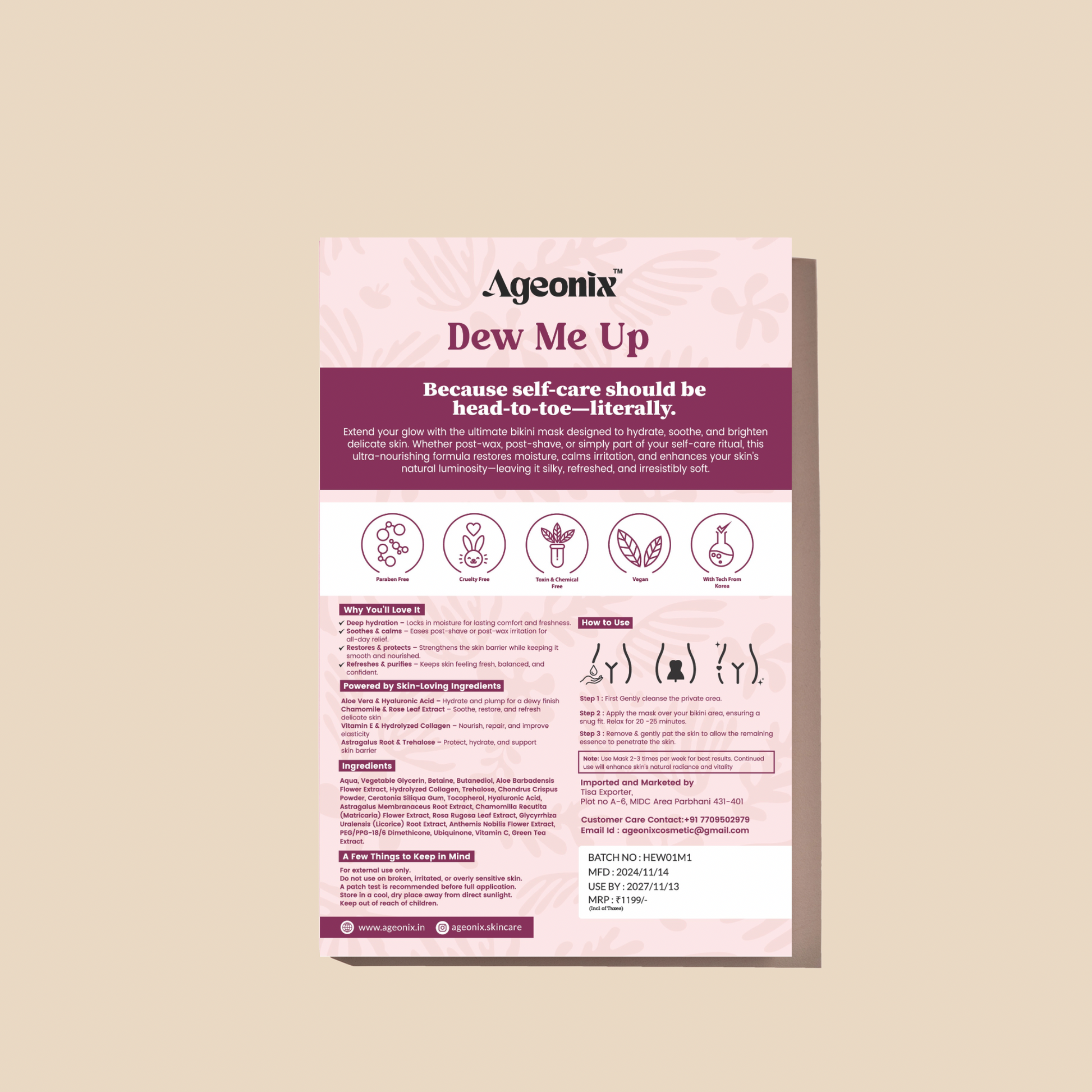 Dew Me Up by Ageonix is a deeply hydrating bikini mask that soothes, brightens, and nourishes delicate skin. Perfect for use post-wax or post-shave, it enhances your glow while calming irritation, improving texture, and restoring softness and confidence from the skin outward.