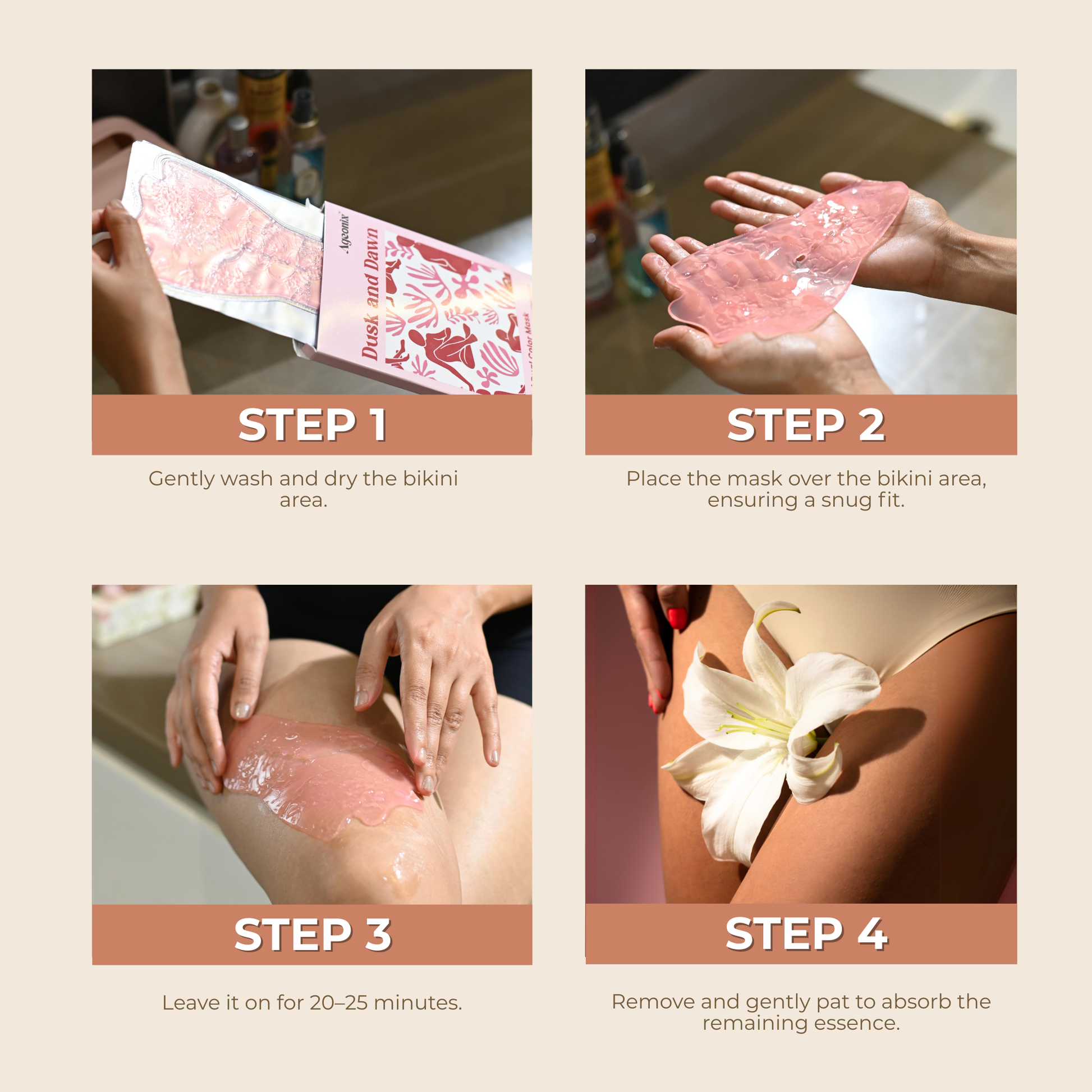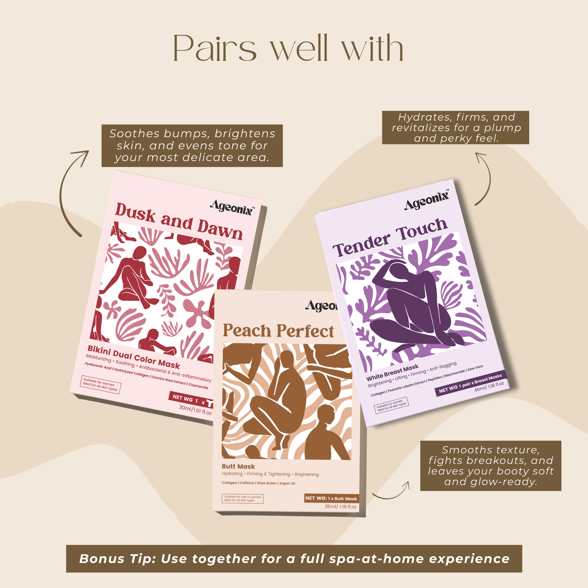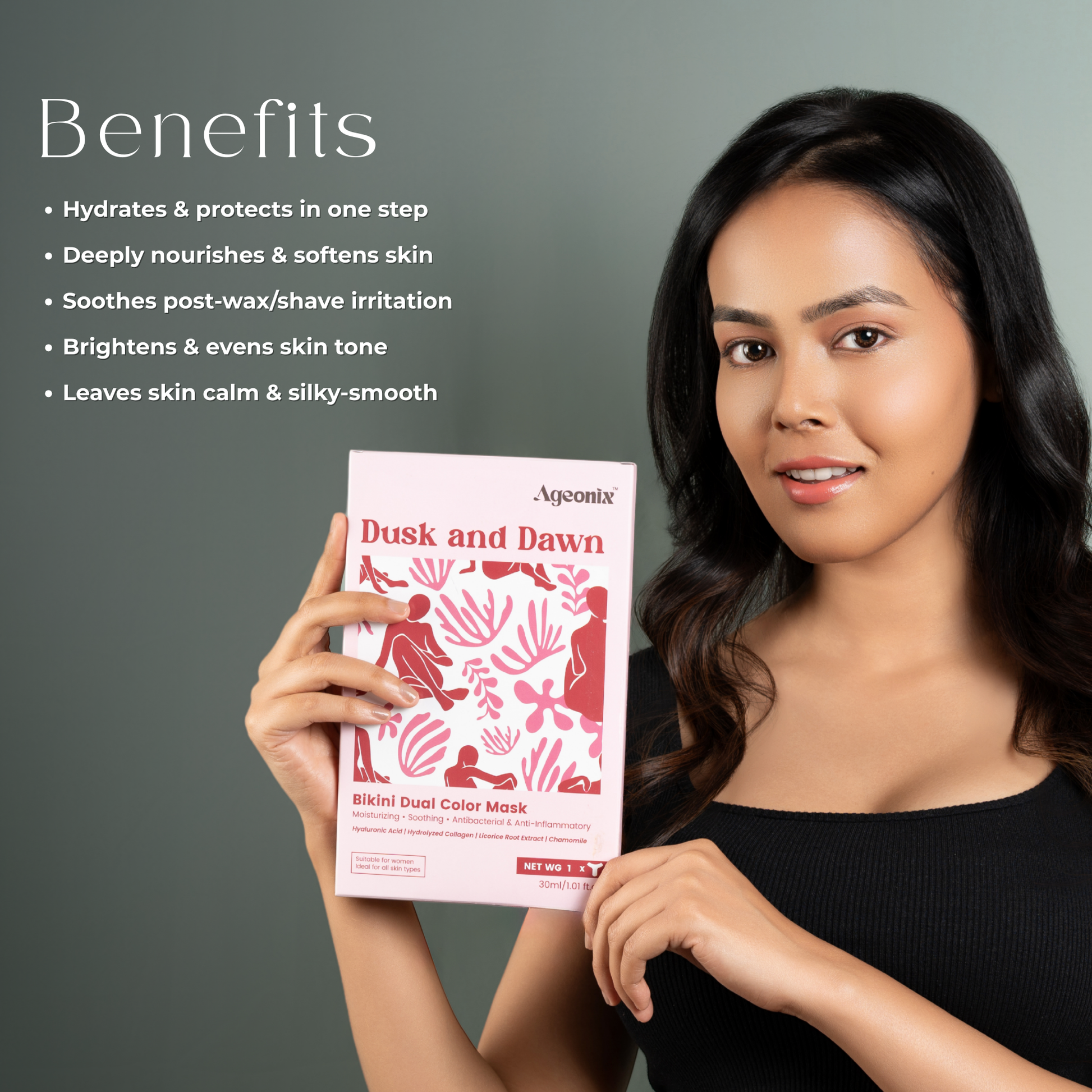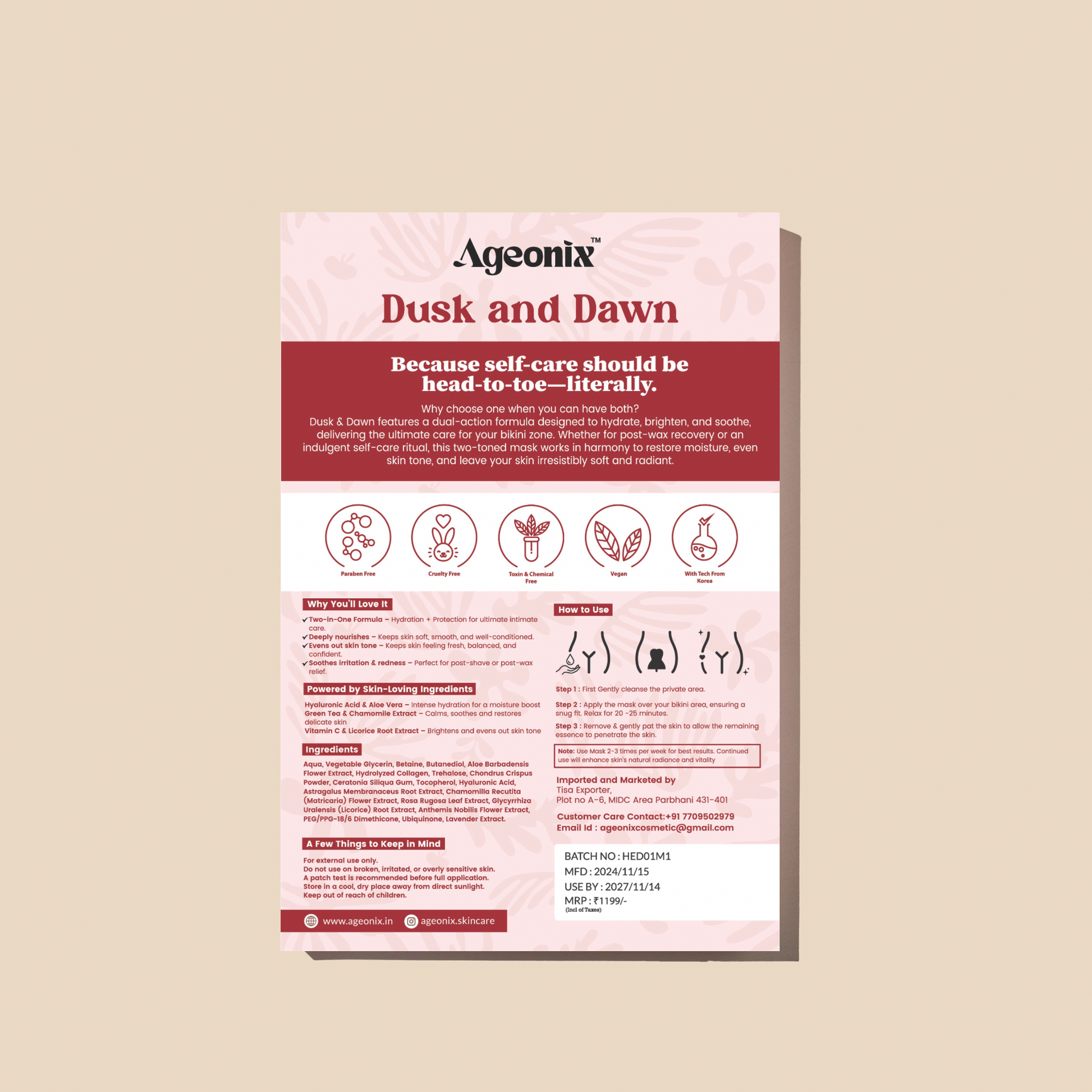 Dusk & Dawn by Ageonix is a dual-action bikini mask that hydrates, soothes, and brightens delicate skin. Ideal for post-wax or post-shave recovery, it helps even tone, calm redness, and restore a soft, radiant look to your intimate area.
