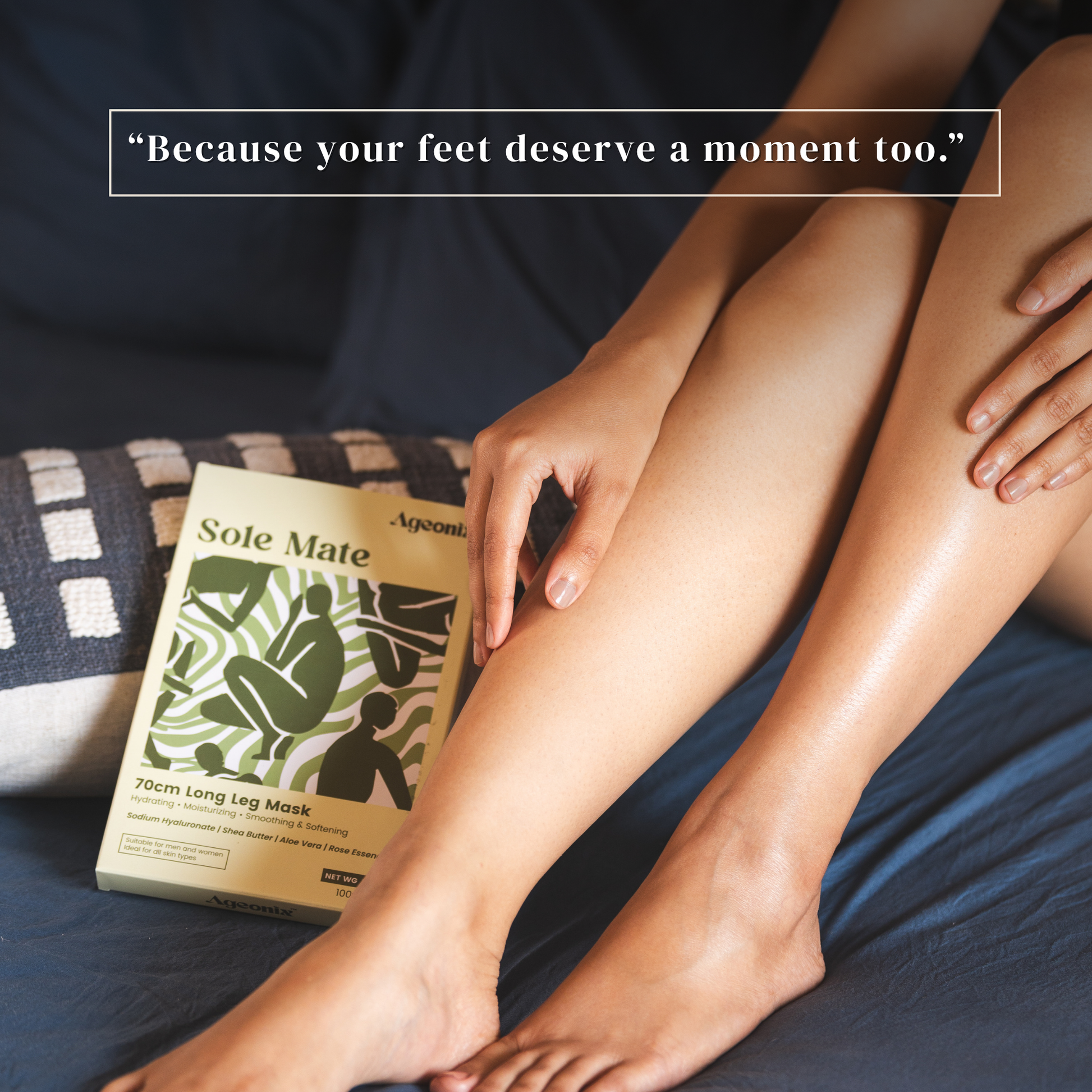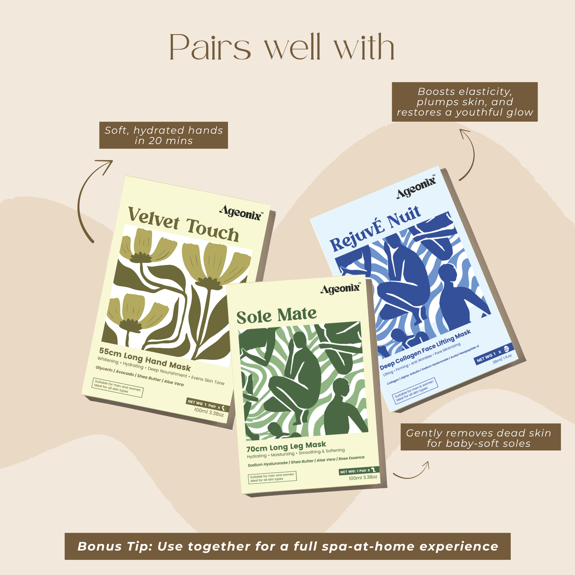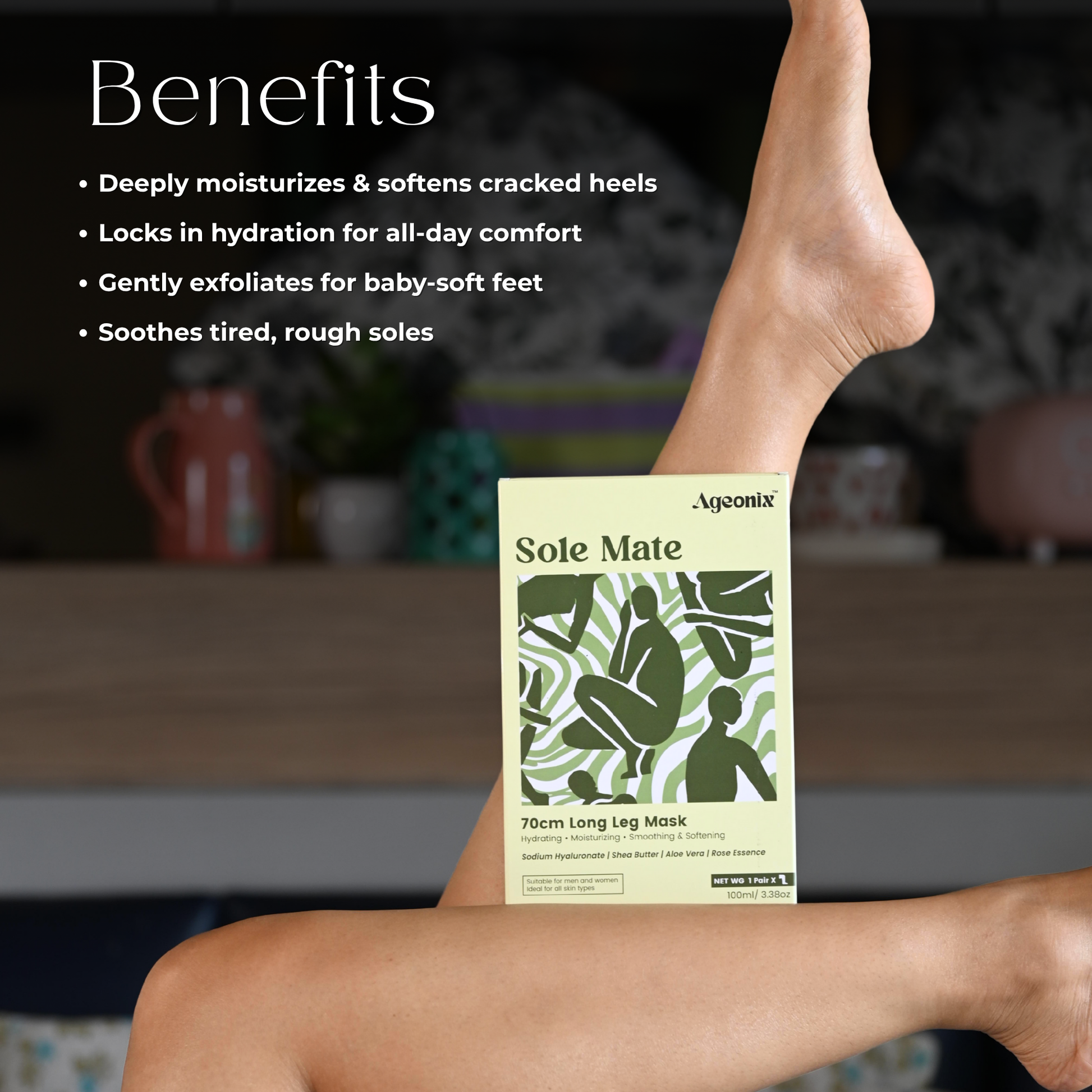 Sole Mate Foot Mask by Ageonix is a 70cm ultra-long foot mask designed to hydrate, exfoliate, and revive rough, cracked skin. Powered by shea butter, aloe vera, and hyaluronic acid, it transforms your feet with deep moisturization and spa-like nourishment. A perfect choice for baby-soft, rejuvenated soles.