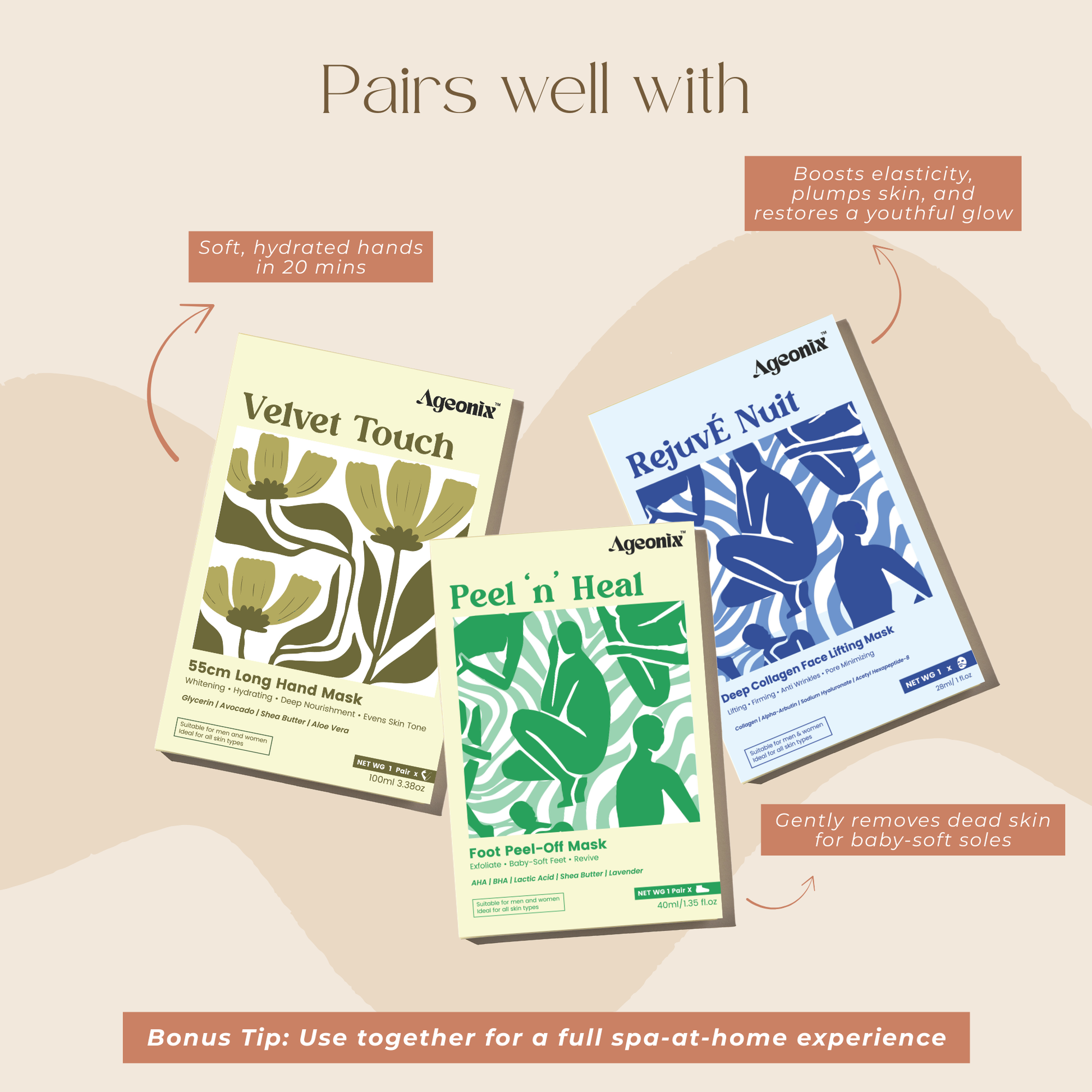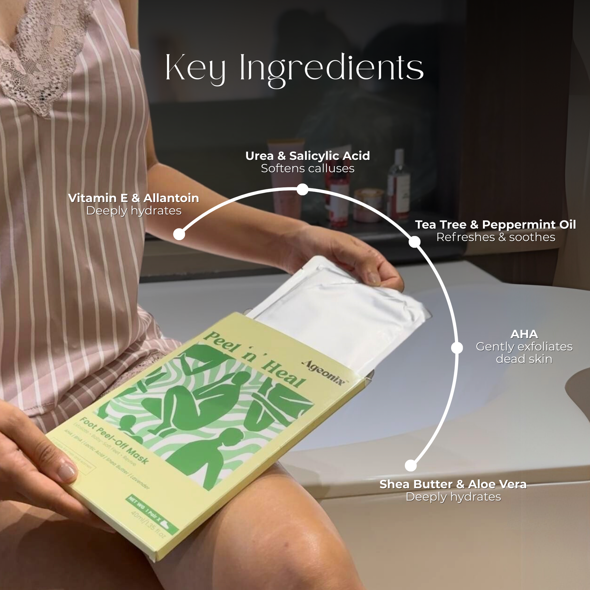 Peel ‘n’ Heal Foot Mask by Ageonix is a transformative foot peeling mask that exfoliates dead skin, softens calluses, and revives rough heels. Enriched with AHA, urea, and tea tree oil, this powerhouse formula leaves your feet feeling fresh, smooth, and spa-soft in just days.