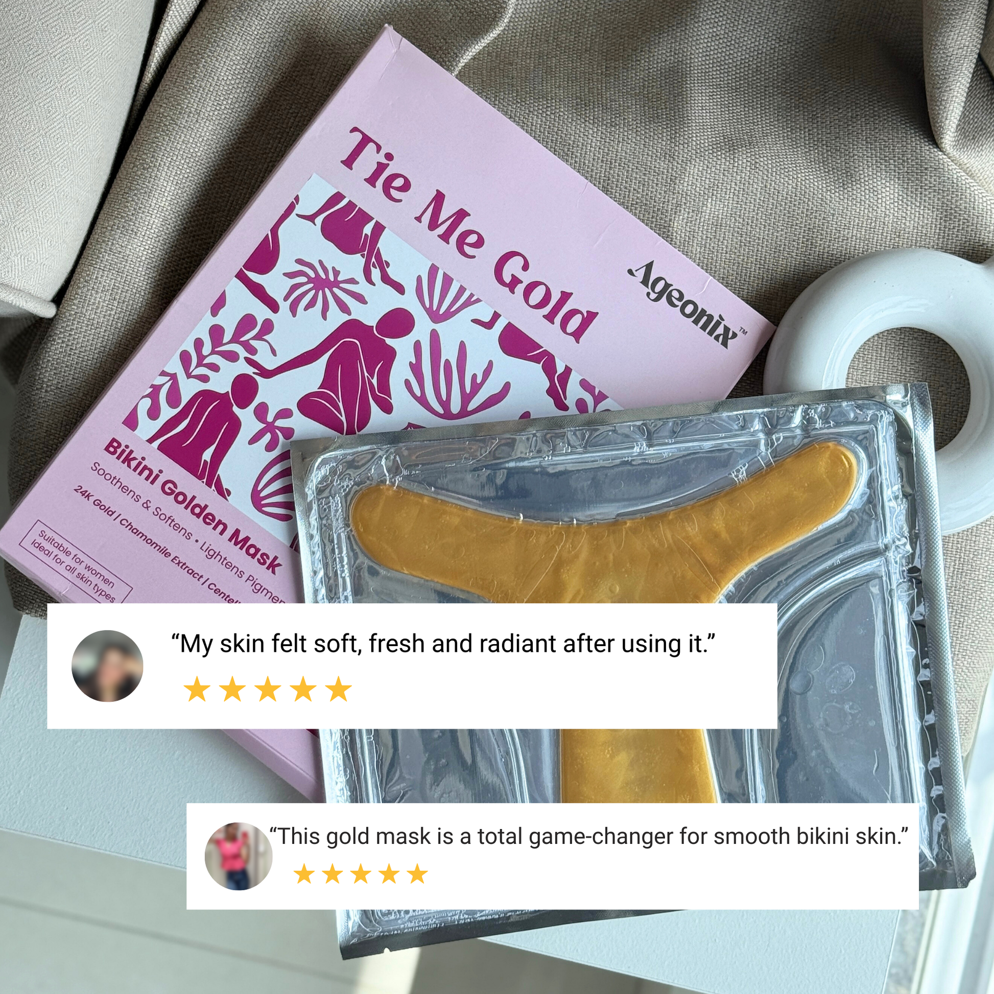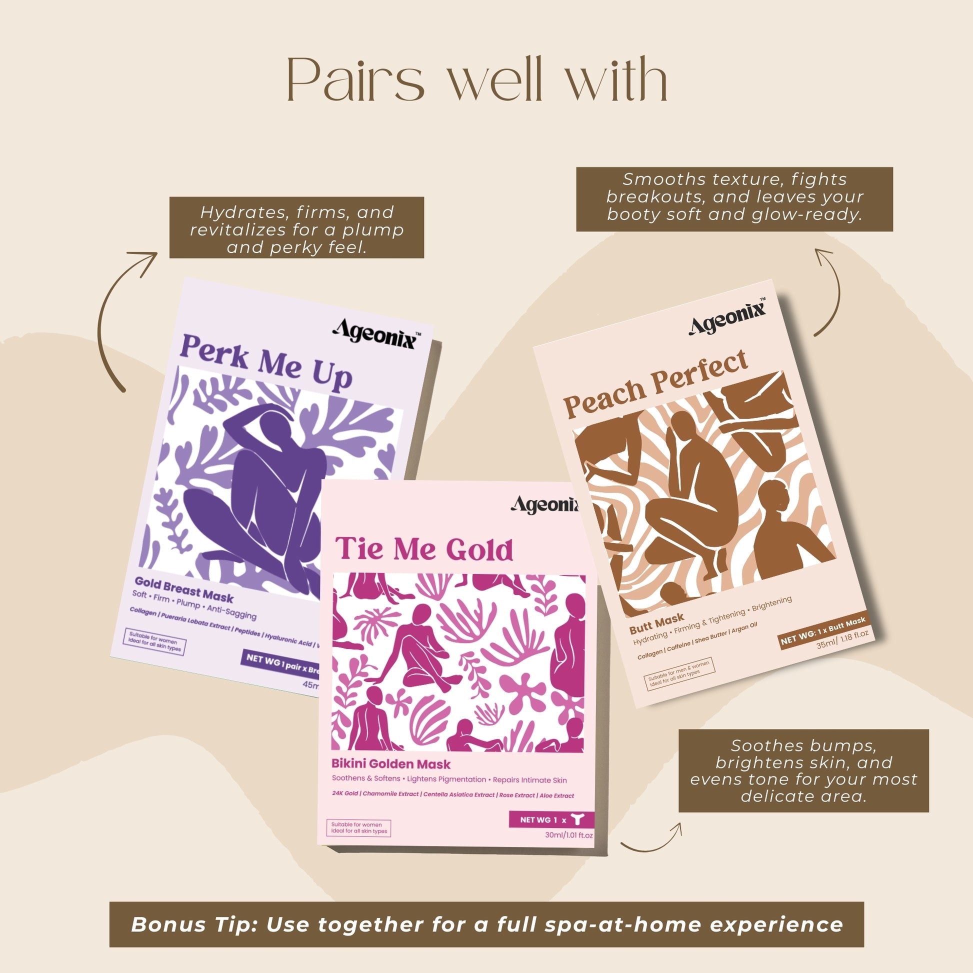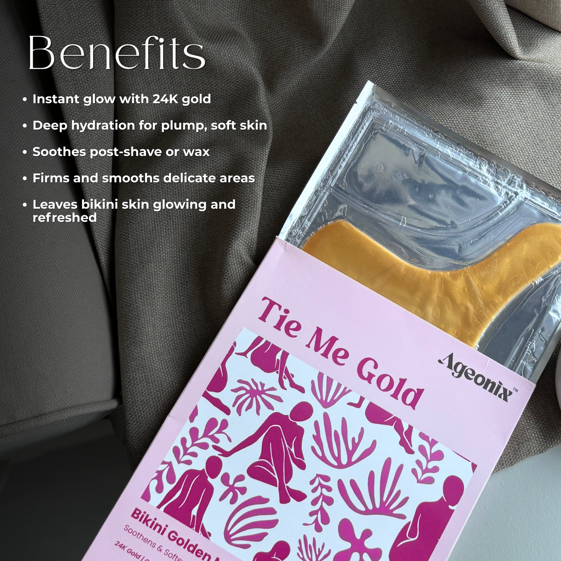 Tie Me Gold Bikini Mask by Ageonix is a luxurious 24K gold bikini mask infused with Vitamin C, aloe vera, and soothing botanicals. This radiant formula delivers deep hydration, helps firm skin, and soothes post-shave irritation, making it a perfect choice for glowing,nourished skin.