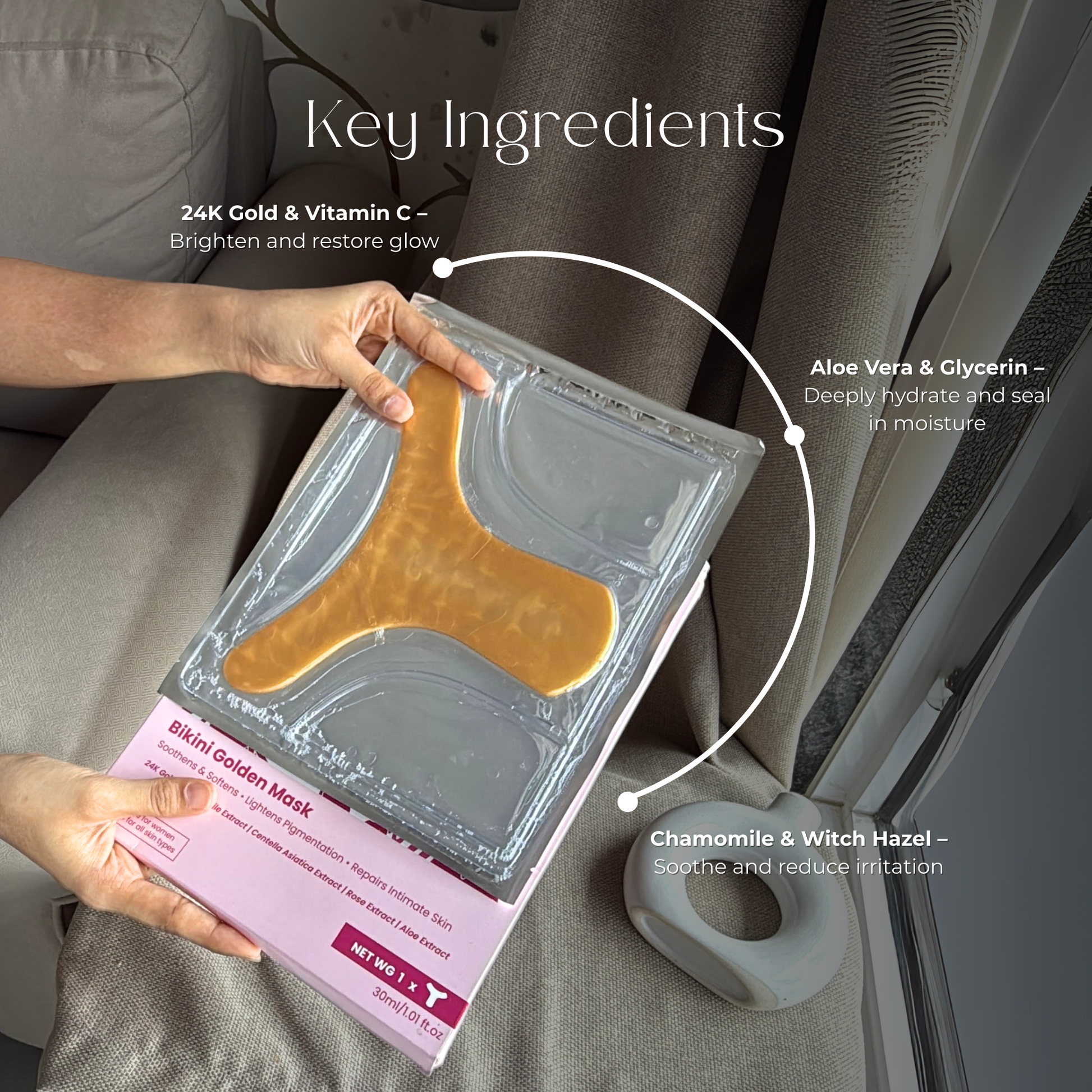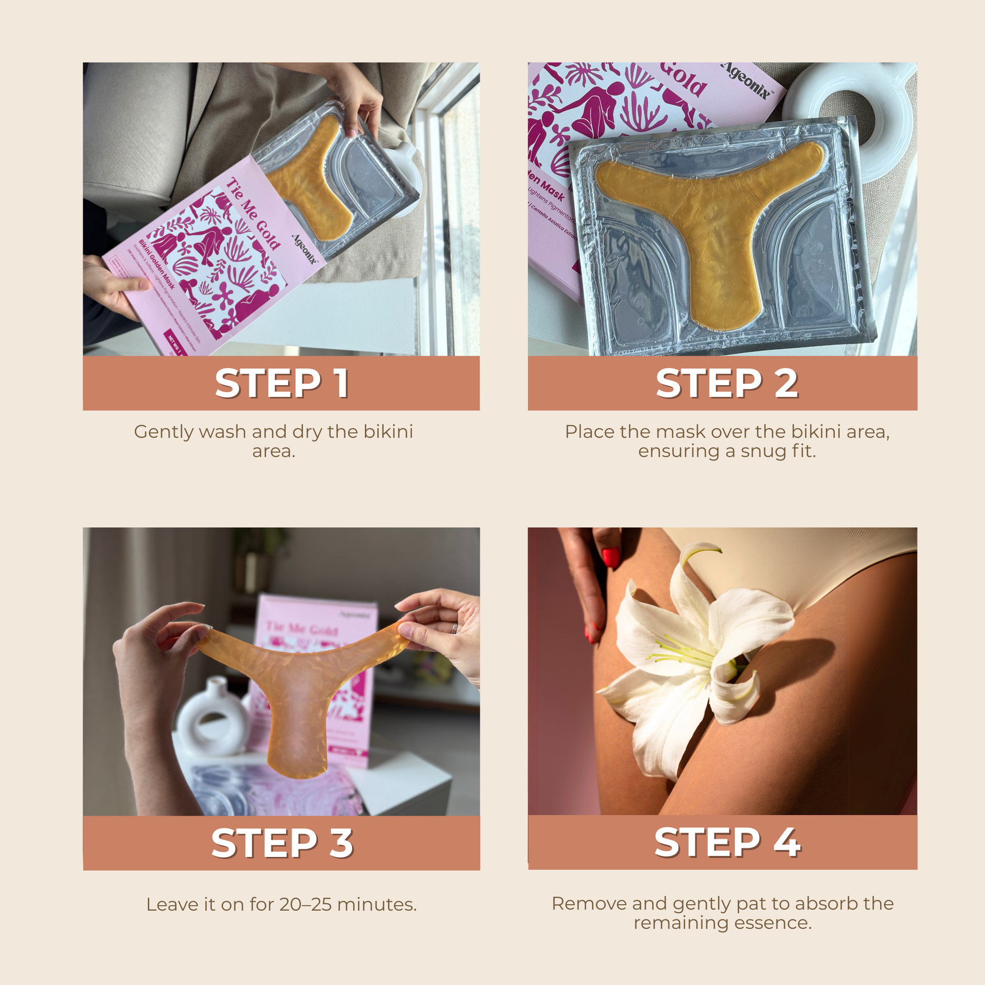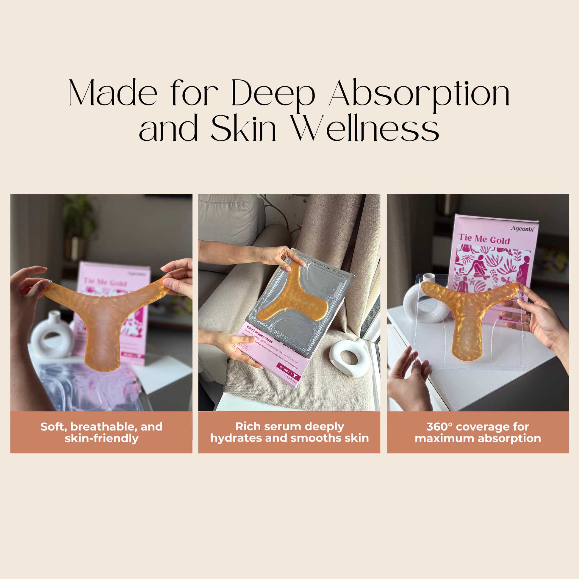 Tie Me Gold Bikini Mask by Ageonix is a luxurious 24K gold bikini mask infused with Vitamin C, aloe vera, and soothing botanicals. This radiant formula delivers deep hydration, helps firm skin, and soothes post-shave irritation, making it a perfect choice for glowing,nourished skin.